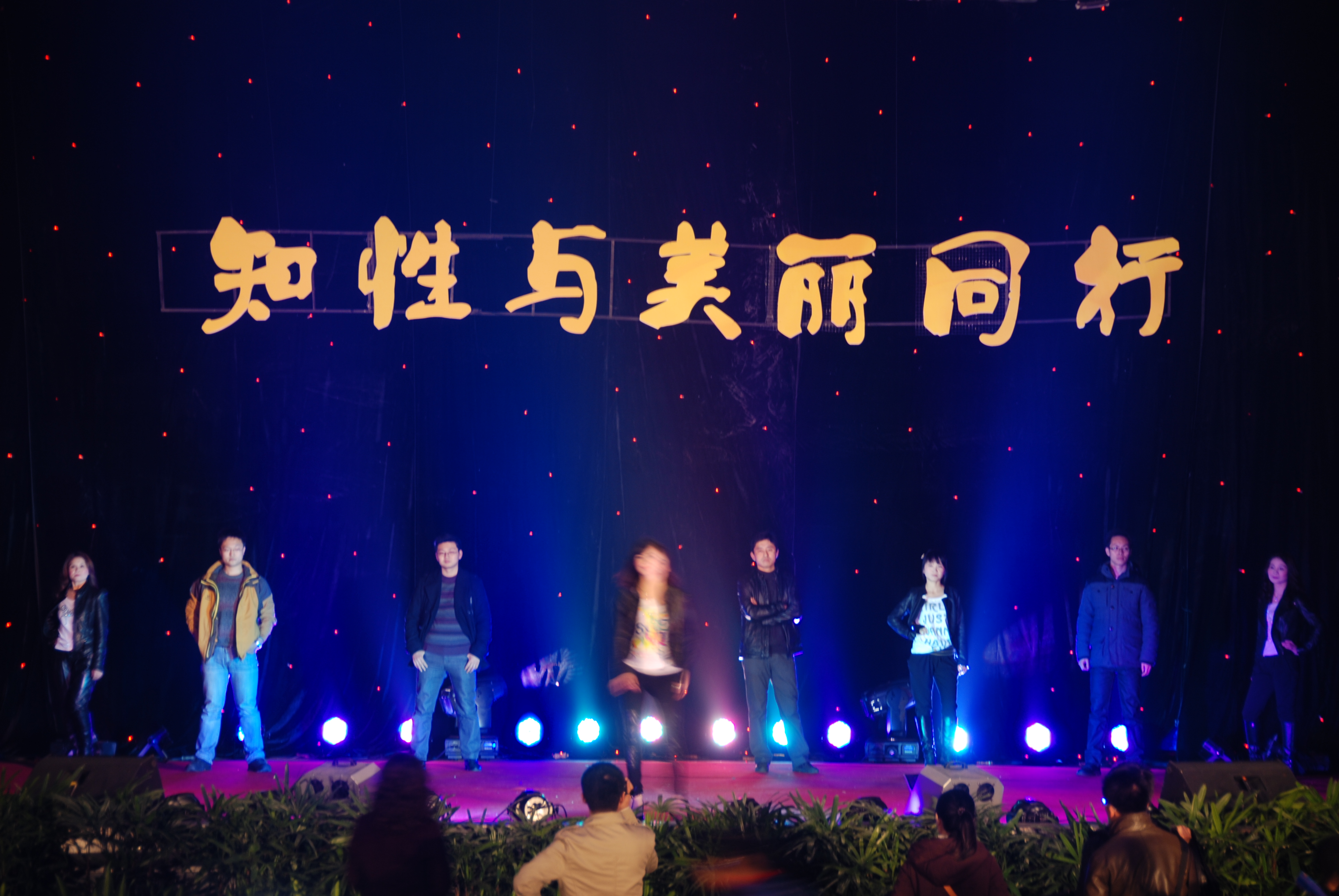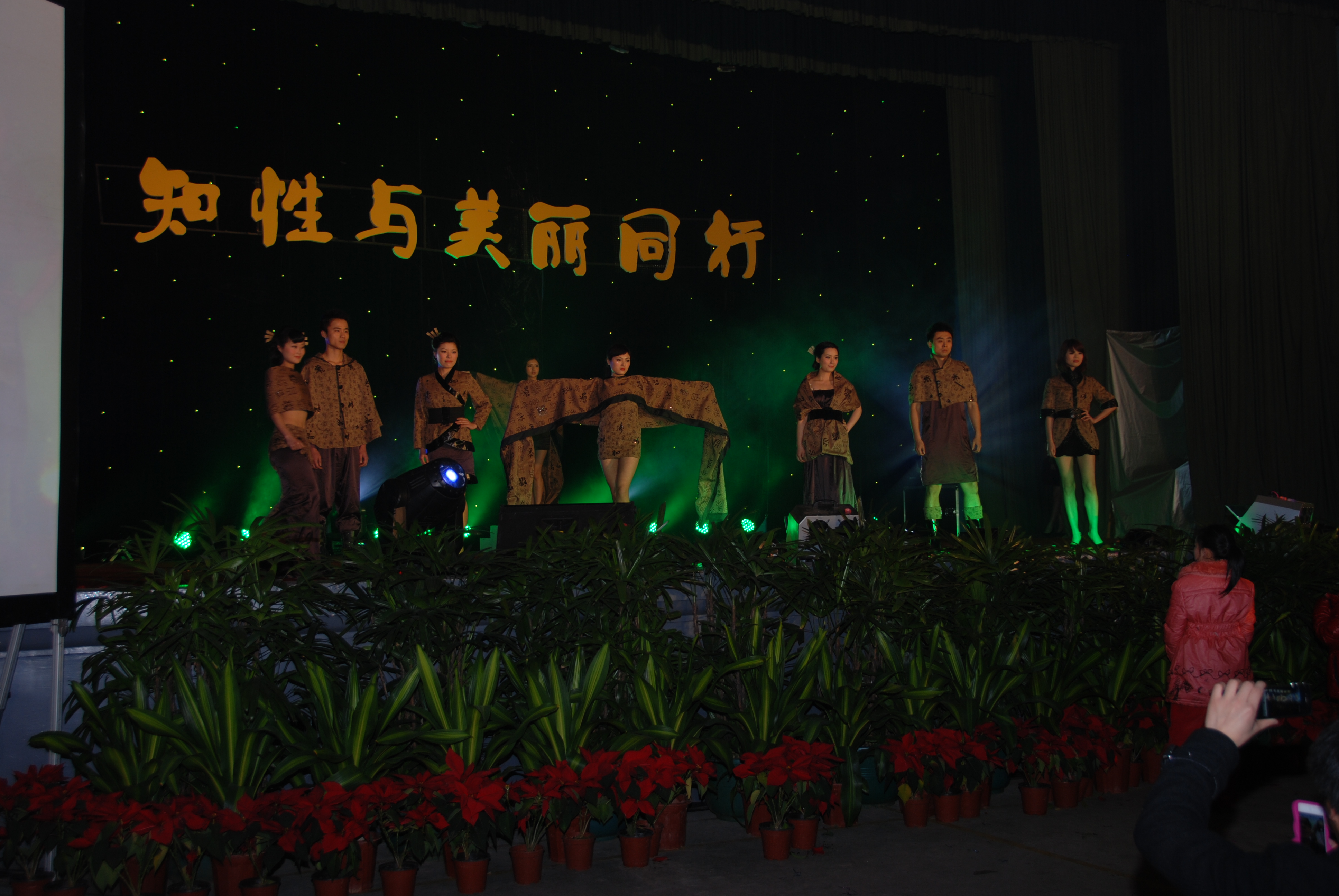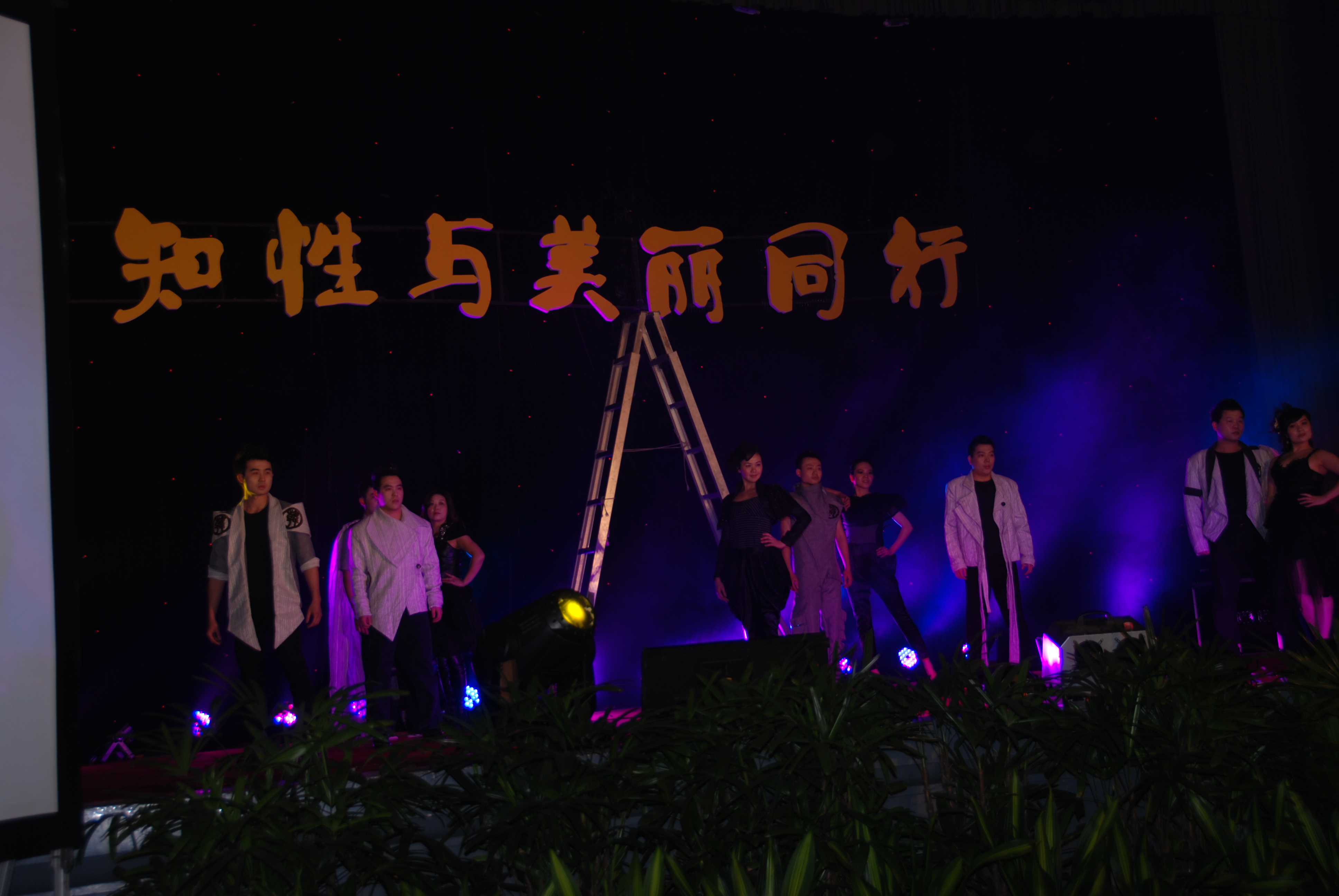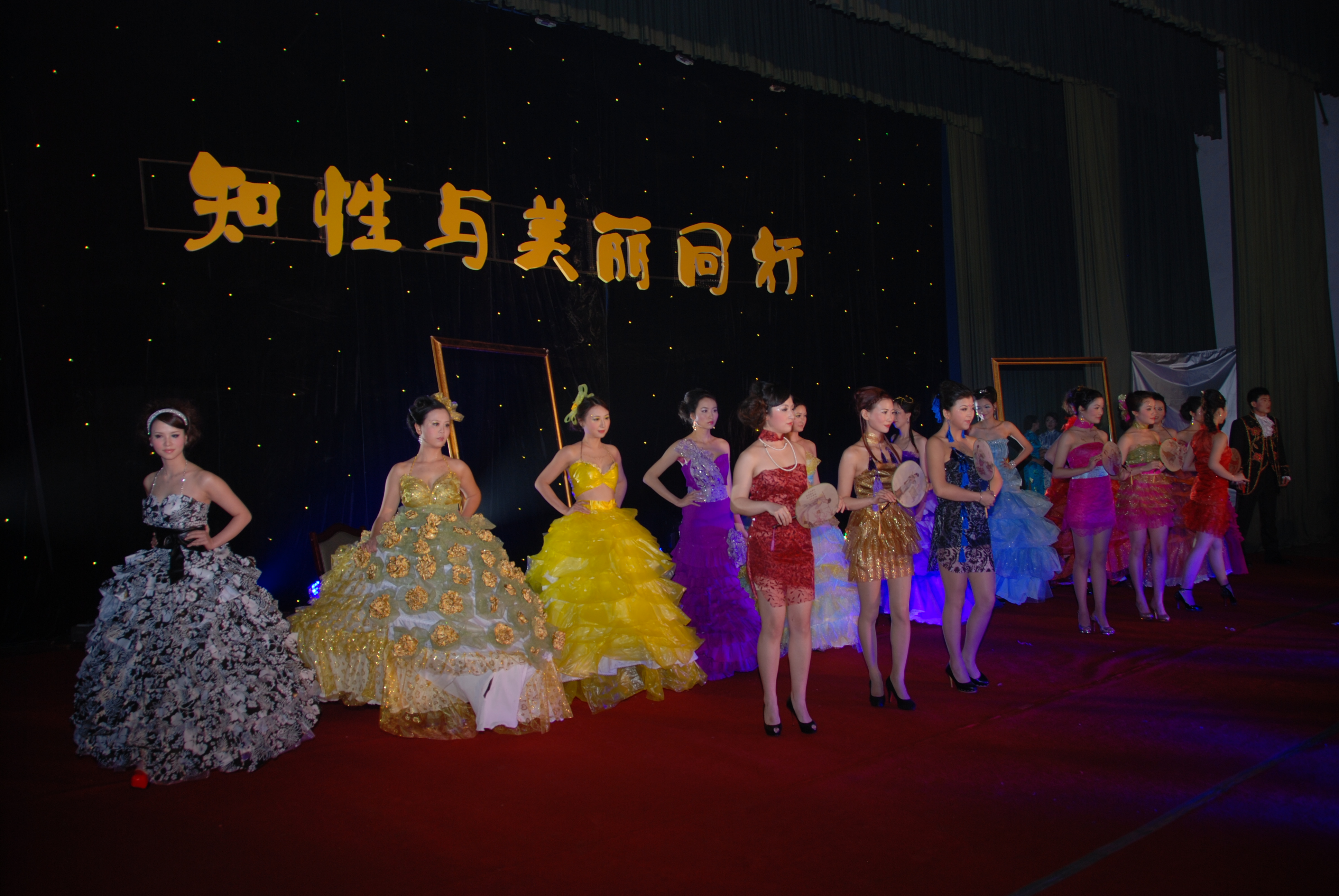 舞台上方显东方女人端庄、典雅。西式的礼服五彩斑斓,应用塑料废品等材料制作成的。黑的色调赏心悦目,玫红的长裙娇艳妩媚,金色的裙装高档华丽,折叠的晚装高雅脱俗,多彩的礼服飘逸大方,玲珑贴身的鱼尾裙魅影浮动、婀娜多姿,神秘的紫色优雅浪漫,柔美的色调甜蜜温馨。多彩画廊,构思巧妙缜密,将画廊美景的表现形式变为现实生活中自我交汇、融合到美丽的服饰,为我们展示了广大职工对生活的热爱,对美丽环境的追求。让天空更加蔚蓝,河水更加清澈。生活更加低碳。让我们用充满智慧的头脑和灵巧的双手,一起化腐朽为神奇,去编织我们的美好生活的多彩画廊。