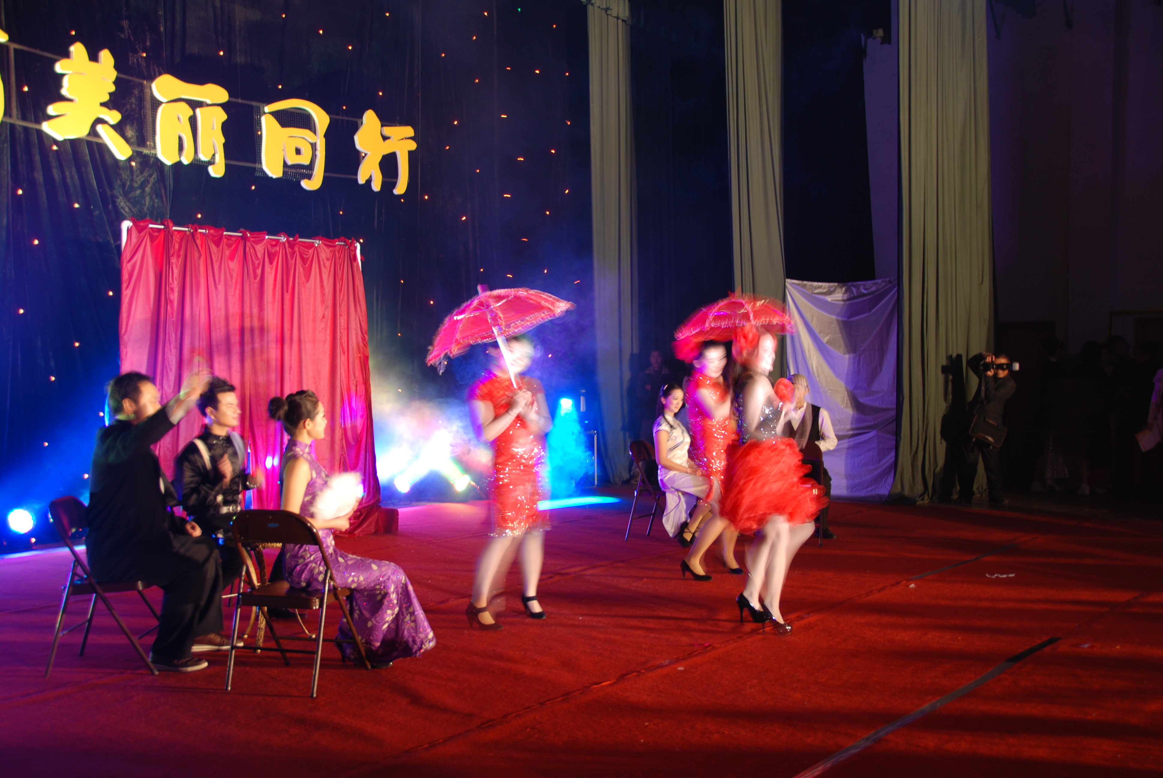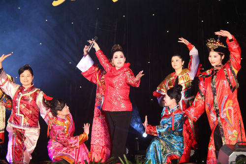 金色绸缎裙裾红色丝绸披肩的外国语学院高挑演员舞动身上的轻薄丝纱,演绎出一段强劲震撼的歌舞,闪烁在眼前的金光还未消散,演员们迅速交换了服装,接着上演起京韵中国魂,一曲《前门情思大碗茶》红、粉、黄、蓝四种服装色彩交相辉映,使得造型更加艳丽夺目,手上再持上一把贵气十足的檀香扇,宫殿生活的华丽与高贵被他们表现得淋漓尽致。随着一曲曲《霸王别姬》、《定军山》、《群英会》、《京剧脸谱》,随着戏曲的变化,演员的服装、动作也随之变幻,给人以目不暇接、美不胜收之悦目。