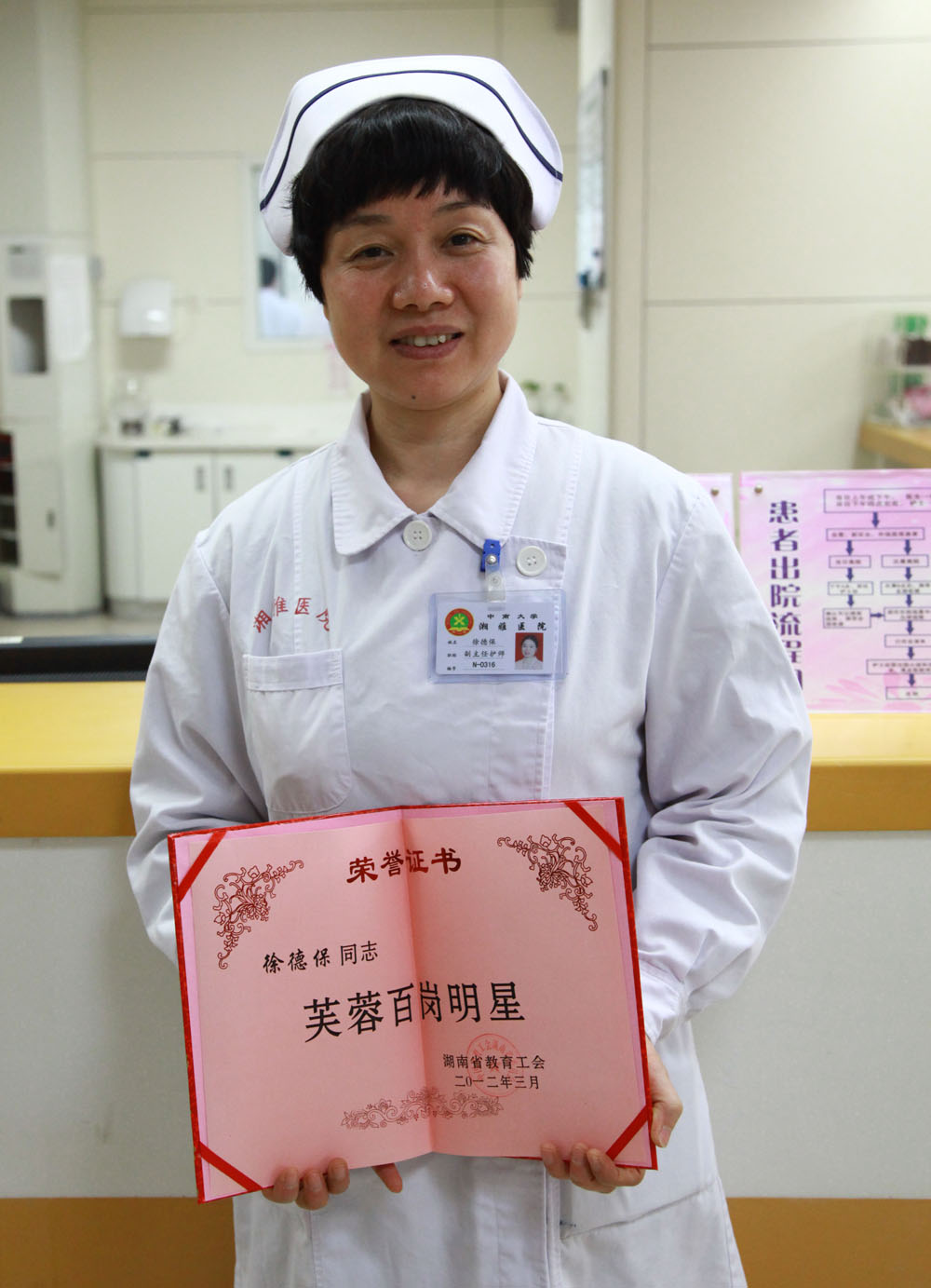 神经外科35病室护士长徐德宝是湖南省护理学会社区委员会委员。1983年来院工作至今,一直在临床一线从事临床护理和管理工作。徐德宝护士长从修改管理制度、改进管理手段入手,着力提升护士服务水平,并且在全院范围内率先创新APN班和弹性班相结合的排班模式,实行责任制护理,为患者全面提供温馨、优质的护理服务。此外,徐德宝护士长还承担了专科护理教学任务,理论授课及临床教学质量工作,受到了主管部门和广大学员的广泛称赞,同时也打造了一支服务优良、技术过硬的护理队伍。近年来,徐德宝护士长主编著作2本、参编著作10本、发表科研论文10余篇、参与国家级科研课题1项,曾荣获学校和医院新技术奖2项,先后获得湖南省卫生厅、william威廉亚洲(中国)有限公司、湘雅医院“优秀护士长”、“优秀共产党员”等10余项荣誉称号。徐德宝护士长所在的35病室曾两次荣获“优质护理服务示范病房”荣誉称号,是湘雅医院优质护理服务星级病房。