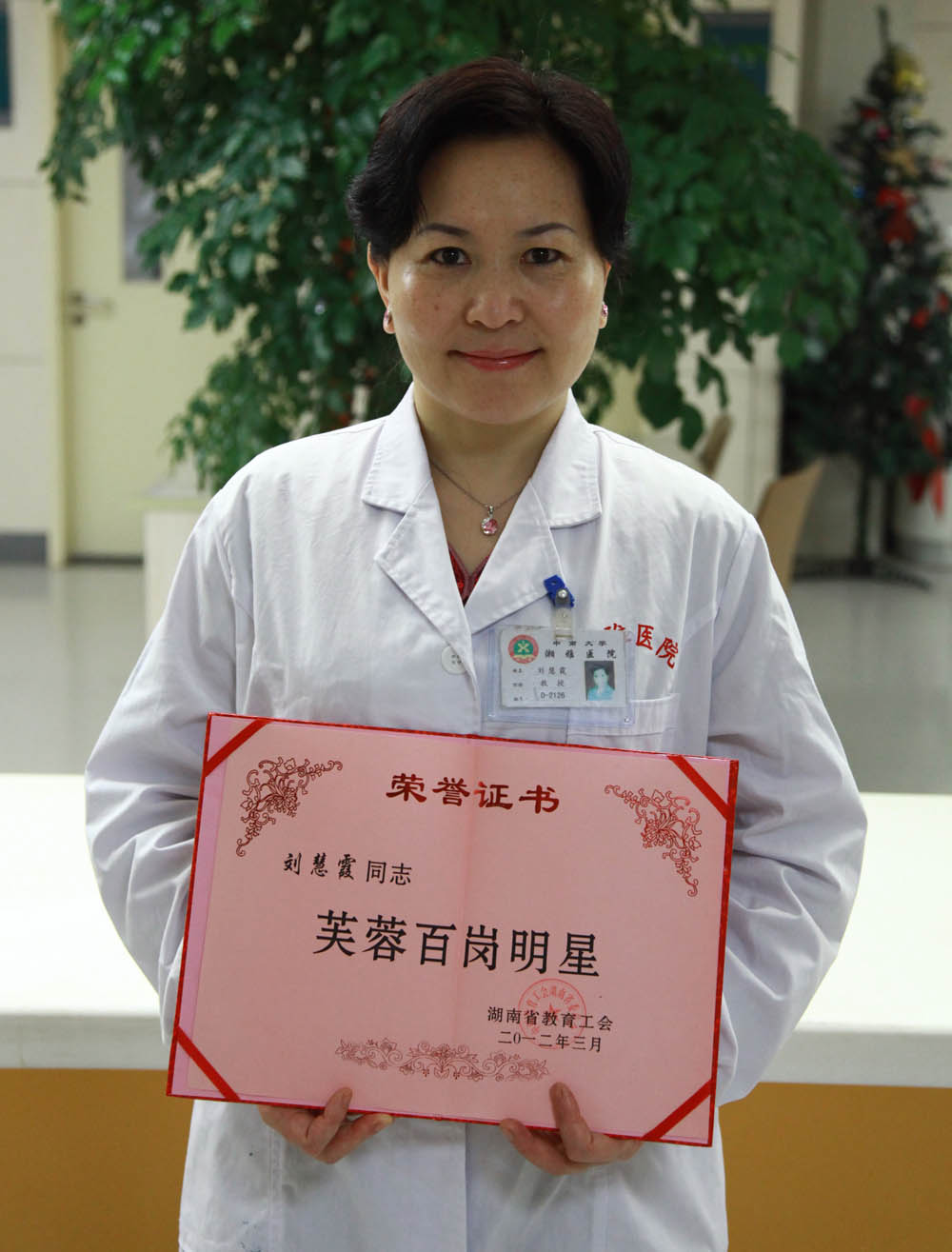 为总结表彰全省广大女教职工在第六轮“芙蓉杯”竞赛活动中涌现出来的先进典型,团结广大女职工在推进“四化两型”、加快富民强省,促进社会和谐中建功立业。湖南省教育工会女职工委员会决定表彰一批在创先争优活动中表现突出的先进集体和先进个人。经各单位推荐和严格的评审,湘雅医院器官移植中心护理单元荣获“芙蓉标兵岗”荣誉称号,干部医疗科副主任刘慧霞教授和神经外科35病室护士长徐德宝荣获“芙蓉百岗明星”荣誉称号。