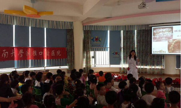 牙体牙髓科陈敏慜医生为童话里幼儿园小朋友进行了口腔健康讲座,小朋友们认真听课,积极参与回答问题,互动气氛非常热烈。经过半个小时的讲课,小朋友们掌握了基本的儿童口腔保健知识。讲座结束后,湘雅口腔医院4名医生对近百名小朋友进行了口腔义诊,发放了宣传手册和小礼物,医生通过对儿童龋齿流行情况进行登记,发现绝大部分儿童龋齿未得到及时治疗,儿童反牙合 未得到矫正,反映出大部分家长对儿童口腔健康知识了解的不足,对儿童口腔疾病的危害未引起足够的重视。