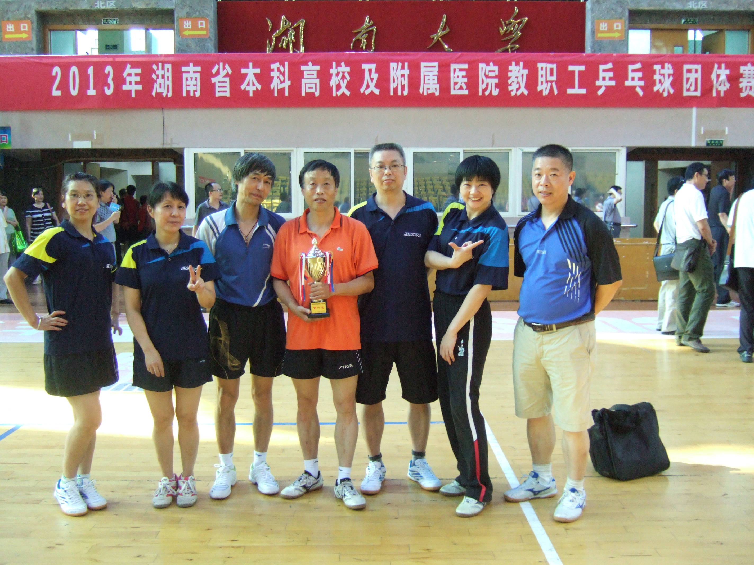 2013年6月15日“湖南省本科高校及附属医院教职工乒乓球混合团体赛”33支队伍经过2天的角逐,在湖南大学体育馆圆满结束,我校乒乓球代表队在校党委高山副书记的带领下取得了团体总分第六名的好成绩。