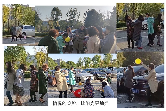 更让笑声穿透云天的,是背靠背夹着气球跑步比赛。同样是一分钟,老师们两人一组,一次比赛两组,背靠背夹着气球先跑到终点,再跑回起点。参赛的老师们信心满满,各找组员,一声令下,开跑!只见其中一组靠得太紧,气球不堪重负,炸了!这两人还在笑、在尖叫时,另一组两人已侧身跳跃,驾轻就熟,仿佛背靠背夹着气球跑了无数次一样,跑到了终点,又开始往回跑了。第一组赶紧接过旁观老师递来的气球,再次奋进,在第二组已跑回起点的时候,终于到了终点,可是气球又掉了!此刻老师们仰头大笑的、笑弯腰的、捂肚子的、跺脚的、拍手的、递气球的……各种姿态不一而足,实实在在诠释了什么是快乐,什么是轻松。繁重的教研工作在这一刹那都被笑声抛上了云天,心情通透敞亮。