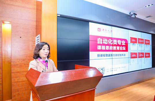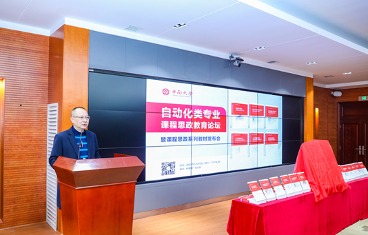 陈翔副校长讲话。他谈到,今天举行的课程思政教育论坛暨系列教材发布会,为学校深入推进课程思政建设起到了良好的示范引领作用。课程思政事关为党育人、为国育才使命,事关学校人才培养质量,责任重大,意义深远。把对学生的思想政治教育与各类课程固有的知识传授有机融合,切实提升立德树人成效,始终是学校全面提高人才培养质量的重大任务。他勉励自动化学院,要继续深入凝练课程思政建设的理论实践成果,充分发挥引领、辐射、示范作用,为全面提升学校人才培养质量作出更大贡献。