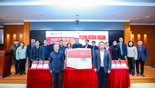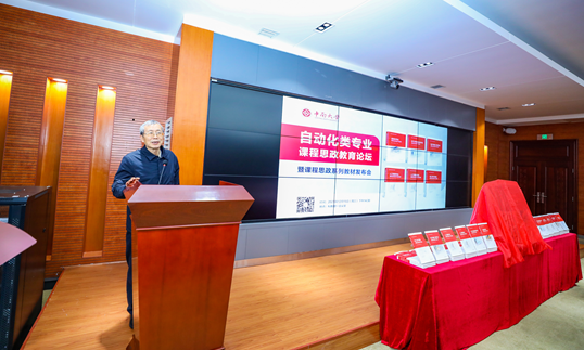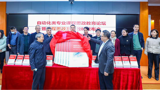在全场师生的见证下,全国教书育人楷模、中国工程院院士桂卫华宣布:《自动化类专业课程思政系列教材》丛书正式出版发行。桂卫华院士与陈翔副校长一起为新书揭幕,会场随即响起热烈的掌声。在场嘉宾为新书的发布共同庆祝并合影留念。
