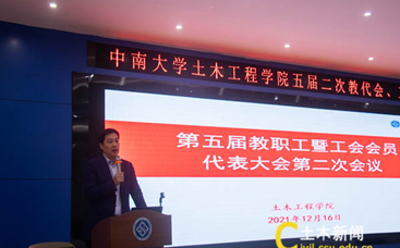 学院院长何旭辉就土木工程学院一年来工作成果进行总结。他指出,过去一年中,土木工程学院在党建工作、学科评估及特色活动等方面都取得了一定的成就。他表示,希望大家同心协力,紧密围绕双一流建设核心和“十四五”发展规划,继续稳步推进一流专业建设,加强学科建设与教学工作的联系,紧抓人才团队建设及科研平台建设,加强产学研用深度融合,加强科研专利的申请、维护、转化,鼓励科研成果进行产业化应用,在疫情常态化局势下做好各类预案,保证各项工作顺利进行。