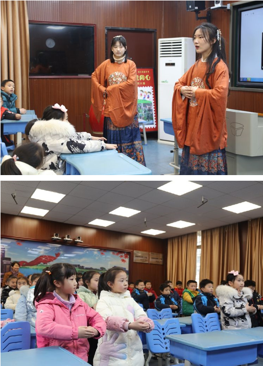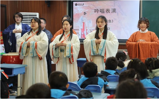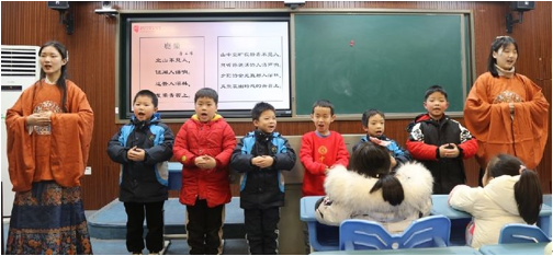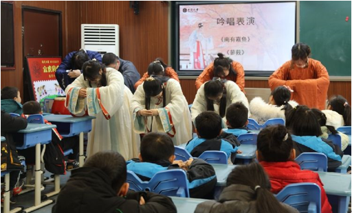 2月23日下午,春雨初霁,吟唱团的哥哥姐姐们着汉服盛装来到中南一附小。孩子们一到录播教室,就被哥哥姐姐们的吟唱所吸引。这优美的吟唱声恰如滴滴春雨,唤醒了孩子们古诗吟唱的嫩芽。