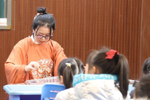 高歌老师介绍了吟唱的基本知识之后,教孩子们用宜兰酒令调吟唱《鹿柴》。“空山不见人,但闻人语响。返景入深林,复照青苔上。”孩子们歌之舞之,笑意盈盈。接着,孩子们又用宜兰酒令调吟唱了《古朗月行》《春晓》《咏鹅》等,清澈的声音恰如春草,渐行渐远渐生。