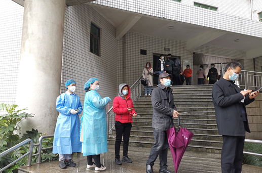 “同学,咱们做核酸检测要注意保持一米距离”“请大家一定要戴好口罩,提前扫描‘场所码’,谢谢配合”“下雨了,请大家往里面走”……此起彼伏的宣传引导声和互相关心声交相辉映,让寒风中的师生心生暖意。