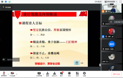 比赛结束后,谭希培教授(图8)进行了点评。他依次点评每个老师在比赛时的表现,部分老师从生活中的案例引入课程思政,深入浅出,不仅直观易懂,且这种浸润式的课程思政模式,增强了学生的代入感,润物无声,值得推广。同时谭教授指出现阶段的教学要摆脱“课程+思政”这种搭积木的模式,逐渐从“课程谈思政”过渡到“课程融思政”的模式,将思政内容自然巧妙的融入课程,老师也要有自己的态度,在教学过程中注重课程难点与思政的融合,做到真正的润物无声。