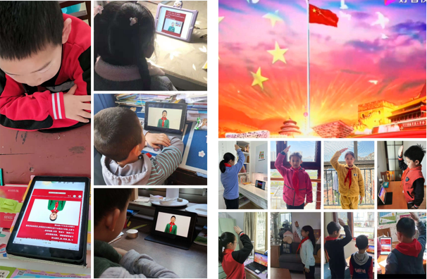 线上升旗仪式开始。同学们隔屏凝视,向着国旗敬礼,高声唱起国歌。