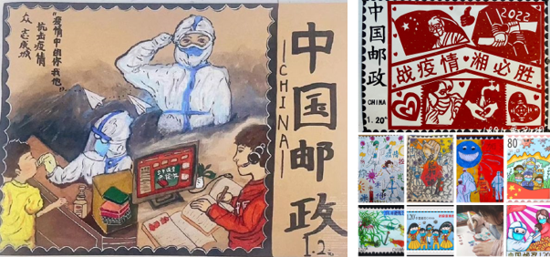 邮票是国家的名片。当大灾大难来临,我们依然能从方寸间汲取向上的力量。“邮”艺减压ing首先为大家展示的是“疫”起加“邮”创意作品。利用绘画创作这一非语言的工具,将潜意识内压抑的情感与冲突呈现出来,让人在绘画的过程中获得疏解与满足,这是绘画心理艺术治疗方法之一。同学们在方寸之间呈现了完整的表现,又在“欣赏自己”的过程中满足心理需求。1802班刘雨欣、1801班高泓玥等同学用综合材料绘画,设计了一张张邮票作品,表达了有疫更有爱,有党更有情,静寂下的星城里,天使在默默逆行,园丁在谆谆陪伴,疫情里的你我他,守望相助的孤勇者。