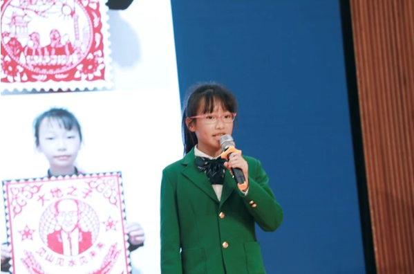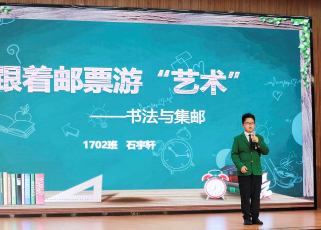 在“跟着邮票去旅行”邮票设计中,同学们用画笔描绘了创意十足的邮学画面, 其中十张作品入选“麓枫六周年明信片”。 现场,陈婵雅同学向大家解说。