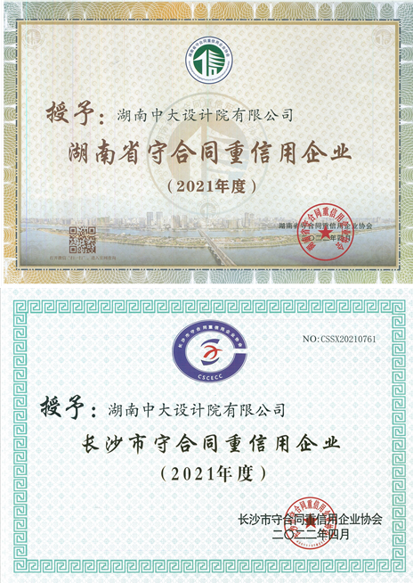 信用是宝贵的资产,守合同重信用,是企业打造品牌、树立形象的关键。近期,经企业申报、协会审核和专家评审,中大设计院有限公司再次荣获湖南省和长沙市“守合同重信用企业”荣誉称号。这是自2013年以来,中大设计院有限公司连续9年获此殊荣。
