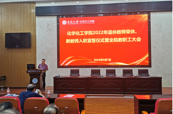 为进一步加强师德师风建设,弘扬尊师重教、崇智尚学的风尚。 9月7日下午三点,化学化工学院在133报告厅首次举行2022年退休教师荣休暨新教师入职宣誓仪式。全体院领导、2022年退休教师、2021-2022年新入职教师、中层干部、教师代表参加了仪式。仪式由学院党委副书记、工会主席刘有才主持。