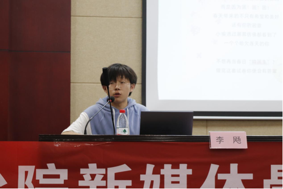 会议伊始,贺林豪老师致辞,强调了青年新媒体中心在学院宣传上的重要作用,表达了自己对新媒体的殷切期望,同时提醒同学们正视自己身上的责任。在贺林豪老师致辞后,李飏部长细致地讲解了如何创作出一篇优秀的微信推文,分别从“策划”“文案”“排版编辑”“审核发布”四个方面全面讲述微信推文制作要点。他强调,推文制作人应当将质量置于流量前,用扎实的本领去收获读者的喜爱。