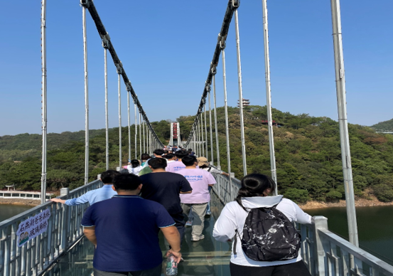 最后,大家还兴致勃勃进行了徒步玻璃桥等项目的体验,玻璃桥上,层林渐染,老师们深深感受到了秋天大自然的馈赠,也充分展示了化院人积极、健康、向上的精神面貌!