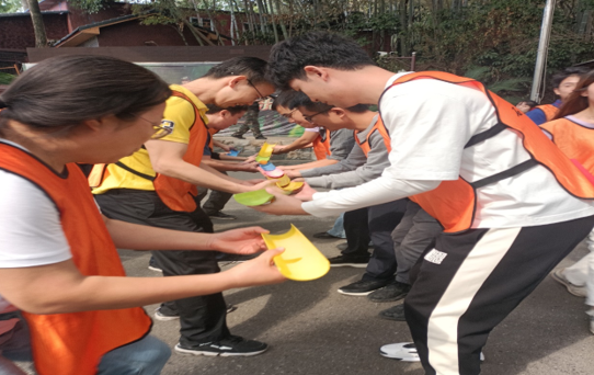 上午八点半,老师们准时抵达了峰峦秀削,绿荫匝地的基地。在教练的带领下,老师们被分为黄、红、蓝、橙四个团队。首先是团体竞技小游戏环节。每个队要求在最短的时间内完成接力运球入杯、拽鼓击球、极速排位等四个项目。