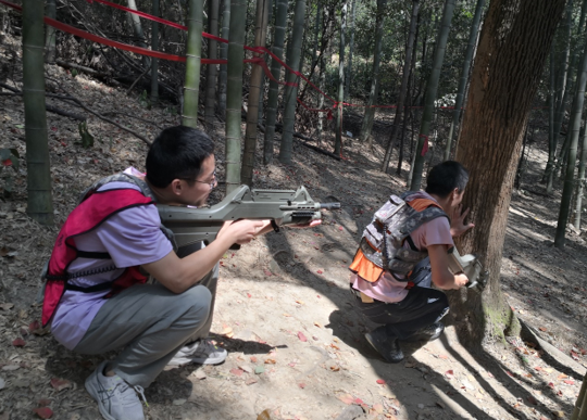 接着,老师们体验了真人CS镭战。四个队伍被并成两个队伍,分别是黄蓝联盟和红橙CP。 “战友们”穿上武装,扛起冲锋枪,在竹林中开展决战。战斗共进行了两轮,异常激烈,老师们忘却了年龄和身份,化身为战士,利用地势和掩体,和队友并肩作战,发起冲锋。