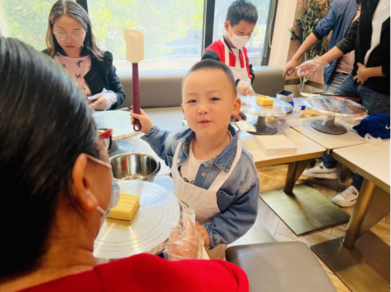参加活动的家长们带着孩子准备就绪:围裙、手套,孩子们全副武装,手拿着工具、品尝着蛋糕小吃,兴奋地忙碌着。在烘培老师的指导下,孩子和家长默契合作,开启了自制蛋糕之旅。家长切蛋糕胚,孩子负责放材料;家长挤奶油,孩子装点蛋糕。在四溢的蛋糕香中,家长和孩子发挥想象,创作出了各自的独家精品。尽管造型各异,却都饱含着浓浓的爱意,现场气氛无比温馨。