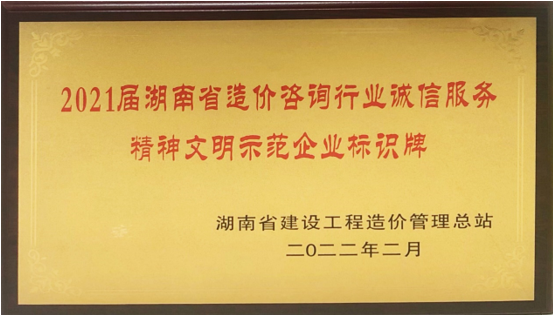 湖南省委宣传部文明处联合湖南省建设工程造价管理总站对2021届湖南省造价咨询行业诚信服务精神文明示范企业工作进行评价,经过对申报企业的资格审查、现场评价、日常活动开展情况审核、职工测评、汇报验收、验收组会议评审等环节的审核,最终确定中大设计院在内的18家企业荣获“2021届湖南省造价咨询行业诚信服务精神文明示范企业”称号,11月中旬,设计院成功获授标识牌。