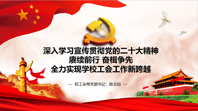陈玉如书记从“准确理解党的二十大对教育、科技、人才 ‘三位一体’统筹安排和一体部署”和“深入学习宣传贯彻党的二十大精神,全力实现学校工会工作新跨越”两个方面进行了解读,并与全体党员分享了对党的二十大精神的学习体会,对2023年度学校工会工作进行了工作部署和安排。陈玉如强调,今年是全面贯彻落实党的二十大精神的开局之年,工会干部要切实把思想和行动统一到党的二十大精神上来,锐意进取、扎实工作,真抓实干、担当作为,全力实现学校工会工作新跨越。