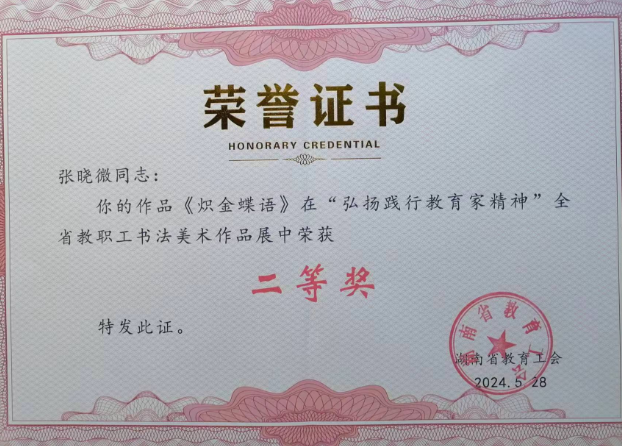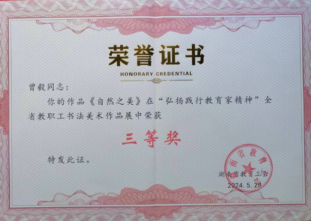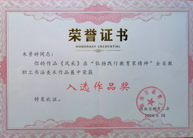 5月底,由湖南省教育工会主办的“弘扬教育家精神”全省教职工书法美术作品展评选活动在长沙师范学院落下帷幕。我校教职工的3副美术作品入选此次展览并获奖。