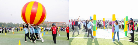 此次比赛分为A、B两大组,采取积分排名制,共设置“屹立不倒”、“精打细算”、“同心协作”、“鸿运当头”、“趣味飞盘”五个项目。在做完热身运动后,比赛正式拉开了帷幕。身着靓丽运动服的各支队伍整齐集结,精神焕发、踌躇满志,成为绿茵场上一抹亮丽底色。比赛过程中,参赛队员们精神抖擞,发扬团队精神,集体协作、默契配合,比赛在欢乐的气氛中进行,各个项目都扣人心弦,趣味盎然。赛场外,老师们自发形成了拉拉队为选手们出谋划策、鼓劲加油,欢呼声一浪高过一浪。