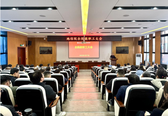 1 月 18 日,地信院全院教职工大会于新校区地科楼 127 报告厅召开。学院党委书记邵拥军、院长李志伟、校组织部副部长穆克朗、学院领导班子成员及全体教职工参加,学院党委副书记刘浩主持会议。