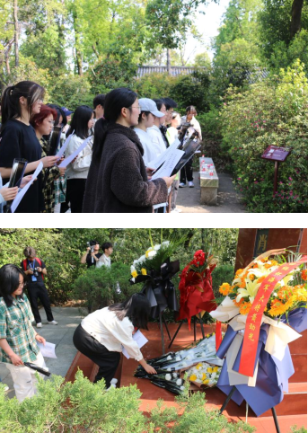 登山队伍首站抵达岳麓山肖劲光铜像纪念园。纪念园绿树苍翠,庄严肃穆,师生们整齐列队,手持白菊,面向铜像肃立,齐唱国歌。随后,现场肃静,师生们垂首默哀一分钟,深切缅怀这位为新中国海军事业作出卓越贡献的开国大将。默哀毕,师生们依次缓步上前,向肖劲光铜像敬献鲜花致敬;全体师生集体诵读《英雄祭》,铿锵有力的朗诵声在山林间回响,表达了对先烈崇高的敬意以及深切的怀念。