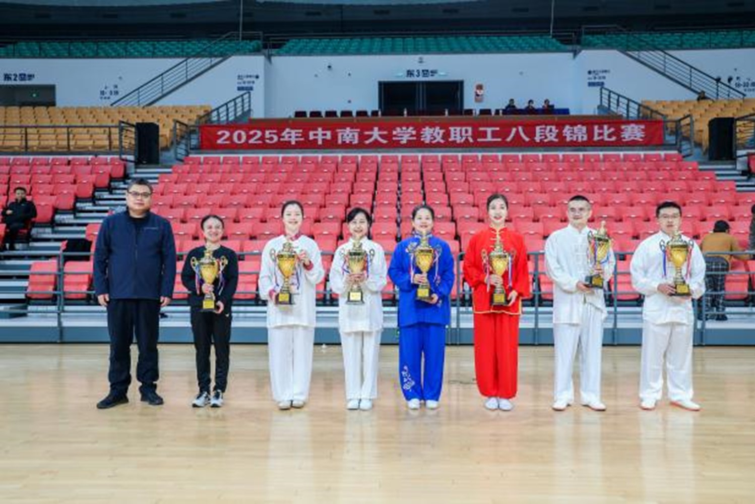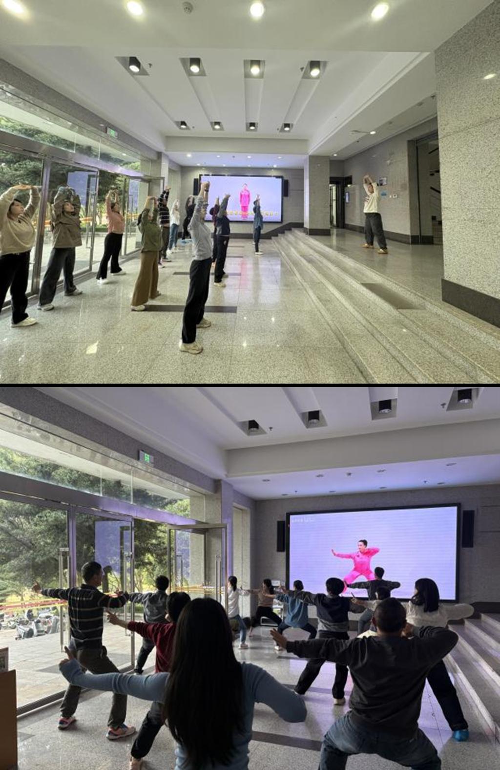 学校发布比赛通知后,中心部门工会积极响应,广泛动员,得到了全体老师的热烈响应,迅速组建了一支中心职工高覆盖度的参赛队伍,形成了“人人想参与,个个愿锻炼”的生动局面。在一个多月的备赛期间,队员们克服工作任务繁重的困难,利用业余时间刻苦集训。从最初的动作生疏到后来的流畅自然,从简单的招式模仿到对呼吸与意念的深入体会,每一次抬手、每一次抱拳都凝聚了大家的汗水与努力。训练场上,既有经验丰富的老师热心指导,也有初次学习的“新手”虚心求教,形成了互帮互助、共同进步的和谐氛围。