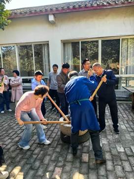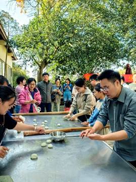 午餐后,活动进入轻松愉快的环节。在“欢乐打糍粑”的集体活动中,男女教职工通力合作,体验着传统美食制作的乐趣,感受着“自己动手、丰衣足食”的满足。自由活动时间,大家或结伴登山览胜,探索古茶园;或沉浸于棋牌K歌,放松身心;或信步走入庄园,在藤架与田垄间寻找自然的馈赠;在馥郁的香草园中,“闻香识草”,辨识各类香草植物,感受着大自然的神奇与芬芳,身心得到了彻底的放松。