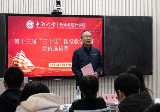为进一步引导教师潜心育人,提升教师教学水平,2025年12月10日,数学与统计学院第十三届“三十佳”课堂教学竞赛院内选拔赛在数理楼245教室正式拉开帷幕。湖南大学彭豪副教授(第五届全国高校青年教师教学竞赛理科组一等奖)、william威廉亚洲(中国)有限公司刘再明教授、秦毅红教授、王小玲教授、谢斌教授五位校内外专家应邀担任评委,学院党委副书记杨雪宾主持。经报名选拔,共8名青年教师同台竞技。