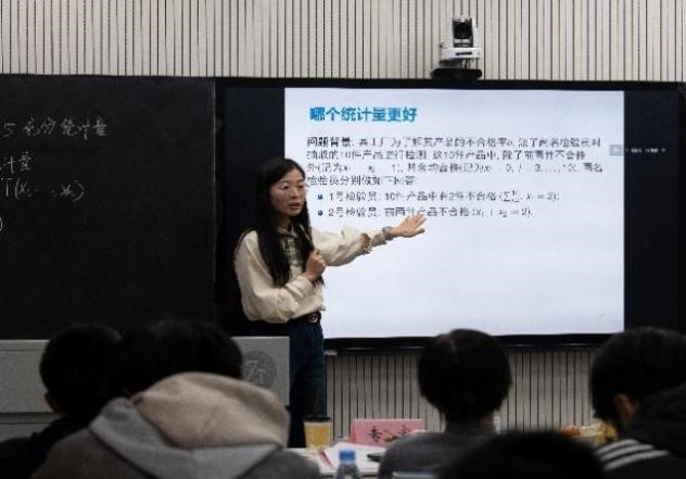 李振振老师以费马引理作铺垫,层层递进推导罗尔中值定理,清晰勾勒出数学定理间一脉相承的逻辑脉络;谌昭老师回溯狄利克雷密度定理的发现历程,深刻诠释“大胆假设,小心求证”的科研治学精神;吴晓春老师借医学检测的临床切片激活贝叶斯公式,具象化演绎数学工具在交叉领域的实践价值;汪泓泽老师对Picard-Lindelöf定理的讲解条分缕析,节奏张弛有度,尽显扎实专业功底;王璐老师现场演示汉密尔顿蒙特卡罗采样过程,举止从容沉稳、课件设计简约精当;杨柳青老师依托货物检测报告的实际情境引入充分统计量,深入剖析统计量遴选背后的理论支撑;运东方老师精准锚定学生学习泰勒公式的易错痛点,循循善诱地拆解定理的构造逻辑与推导路径;张晓江老师梳理正态分布核心性质时表达流畅自如,板书书写与口头讲述协同耦合、互为注脚。