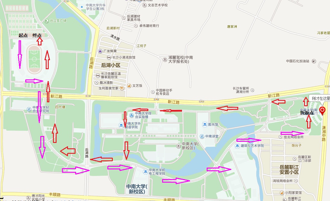 起点:鸟巢外排球场(刷卡)→→ 鸟巢西边马路 →→ 机电院大楼 →→折返点:新校区东门(刷卡)→→ 图书馆北面校内马路→→综合实验楼→→ 左拐外语院楼→→终点:鸟巢外排球场(刷卡)。