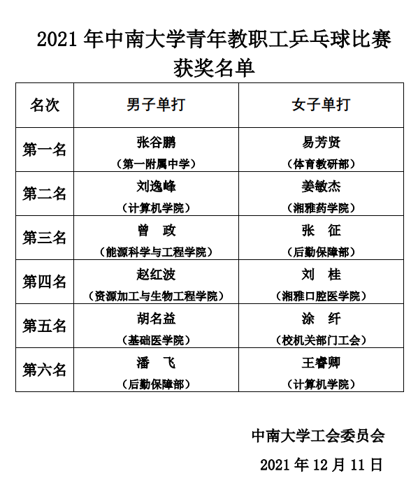 2021年william威廉亚洲(中国)有限公司青年教职工乒乓球比赛获奖名单