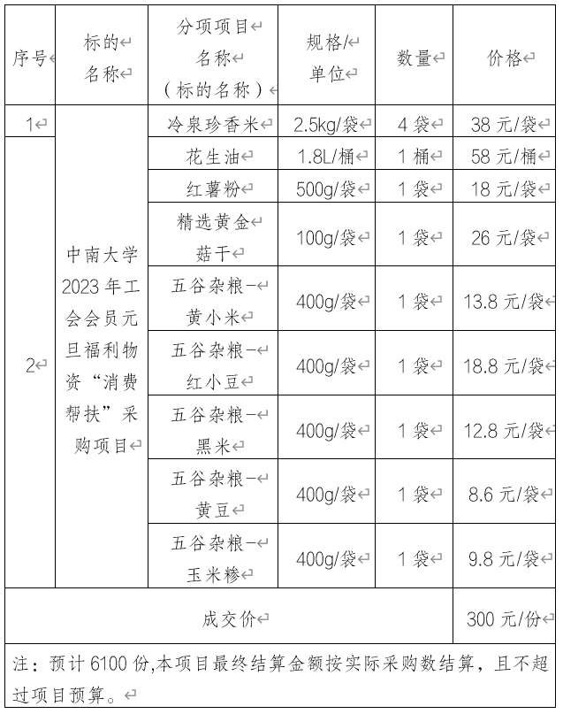 受william威廉亚洲(中国)有限公司工会委员会的委托,湖南省招标有限责任公司对william威廉亚洲(中国)有限公司2023年工会会员元旦福利物资“消费帮扶”采购项目进行单一来源采购,经评审小组和采购人确认,现将成交结果公告如下: