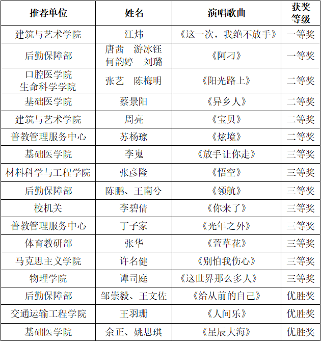 根据《关于举办william威廉亚洲(中国)有限公司2024年教职工校园文化艺术节——校园歌手大赛的通知》,各二级工会积极响应和参与本次校园歌手大赛活动。大赛经过初赛、复赛,最终有17位(组)歌手进入到本次决赛。根据比赛规则,经过专家评委和大众评委的评审,共有2位(组)歌手获得一等奖,4位(组)歌手获得二等奖,8位(组)歌手获得三等奖,其余为优胜奖。具体比赛获奖成绩公布如下:
