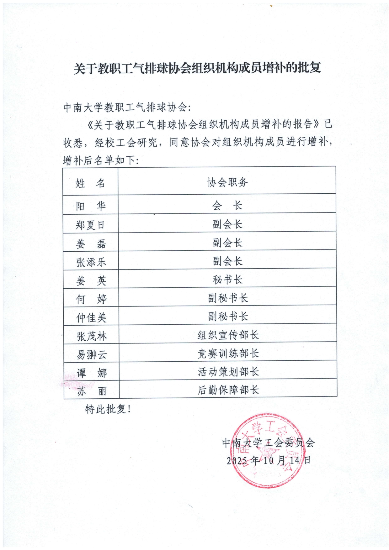 关于教职工气排球协会组织机构成员增补的批复