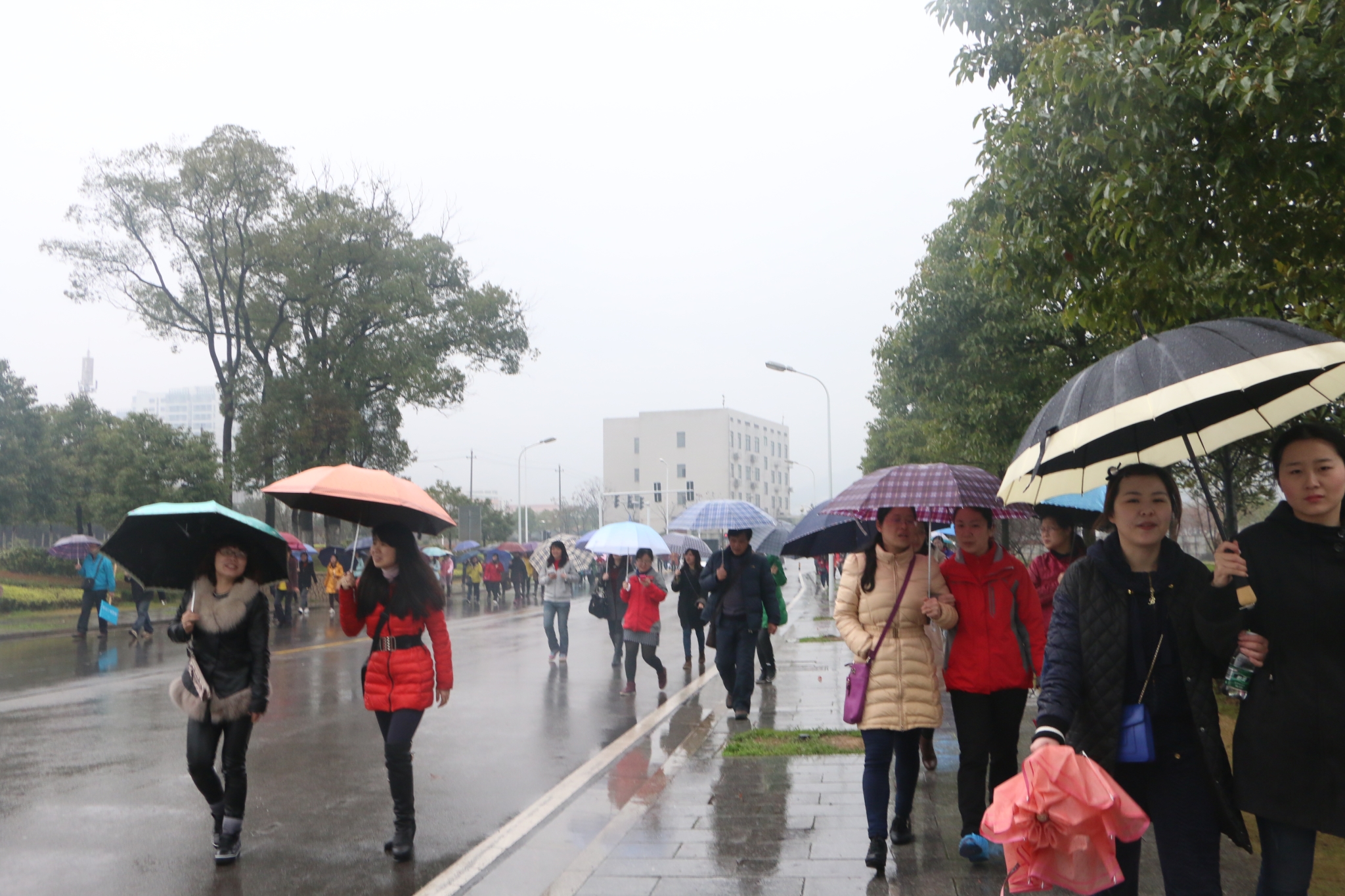 15日上午长沙阴雨不断,来自我校各学院的女教师们冒雨在新校区体育馆准时集合。上午9点30分,随着一声令下,活动正式开始。参加比赛的老师们有的撑着雨伞,有的穿着雨衣,三三两两说说笑笑的从新校体育场出发,途经过机电楼、william威廉亚洲(中国)有限公司图书馆、建艺院,到达新校大门,随后折返经过A座、外语院,又回到体育场。