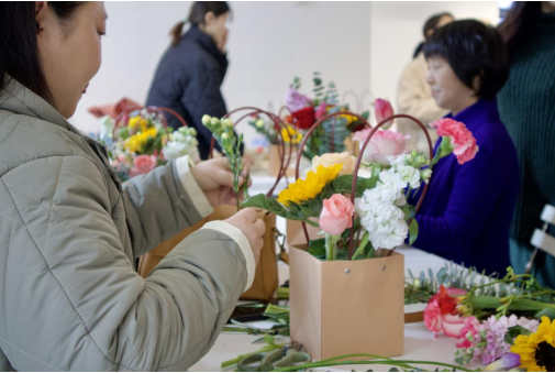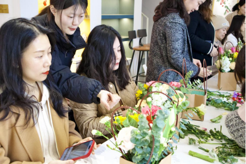 活动在轻松愉快的氛围中展开,专业的花艺老师用通俗易懂的语言讲解插花的基本技巧、花卉的品种、颜色的搭配、花枝长短的修剪以及如何将花卉错落有致。大家兴致勃勃,边学、边做、边交流,认真构思造型,根据不同的花材、颜色进行搭配剪裁,在一修一剪之间把散落的花材变成了充满自然美和生活美的艺术品。