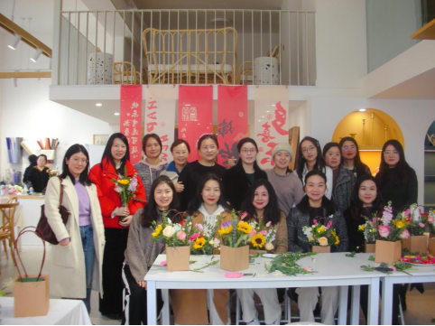 细致精美、赏心悦目的插花作品逐渐完工,让人仿佛置身一片花海,芬芳沁人心脾。享受着亲自创作的乐趣和插花艺术带来的快乐,每个人的脸上都洋溢着幸福灿烂的笑容。活动结束后,大家捧着自己制作的插花作品合影留念。