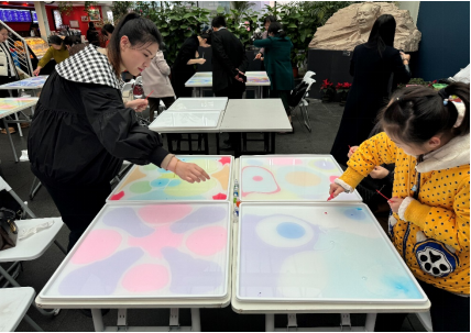 随后,美术馆的老师为大家讲解了水拓技艺的演变过程及水拓丝巾的制作方法。水拓画,又称湿拓画,起源于唐代的“墨池法”,后经丝绸之路流传到土耳其。2014年水拓画被联合国教科文组织列入世界非物质文化遗产名录。制作水拓丝巾,则是把颜料滴入画液中,用画锥拨动颜料进行创作,再转印到丝巾之上。在讲解老师的带领下,大家自由发挥,设计并制作出自己独特的丝巾款式。