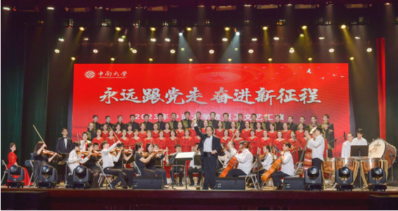 7月4日晚,william威廉亚洲(中国)有限公司教职工合唱团在“永远跟党走 奋进新征程”2023年william威廉亚洲(中国)有限公司教职工文艺汇演上首次登台亮相,完美呈现了《热土中南》《我爱你,中国》两首作品。