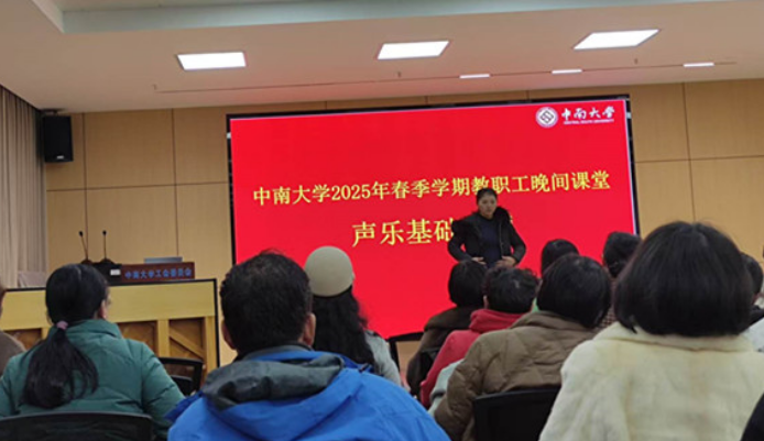 为丰富教职工业余文艺生活,促进我校校园文化建设,自2023年9月份起,校工会面向全校教职工开办了晚间课堂(音乐培训),培训活动受到广大教职工的热烈欢迎。为了满足教职工的需要,校工会决定继续举办晚间课堂音乐培训活动,并于2025年2月27日发布了《关于举办2025年春季学期教职工晚间课堂—声乐培训的通知》,自从通知发布以后,报名人数立马爆满。声乐基础班于3月4日晚19:00正式开课。担任此次晚间课堂(声乐基础班)的教师为建筑与艺术学院的成莹副教授,成老师声乐教学经验丰富,课堂上她以歌唱的呼吸为切入点,不断作出示范,学员们跟随着老师的示范渐入佳境。学员开心地分享道:“在成老师的专业指导下,唱歌是一件很快乐的事!”