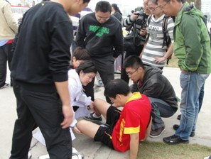 10月28日,在与能源院男排进行的最后一场小组赛中,刘刚老师在奋力救球时不幸腿部撞伤,小腿迅速肿胀,无法活动。但刘刚老师始终注视场上比赛,直到我院男排队员齐心协力,以2:0战胜能源院男排,刘刚老师才同意送往医院治疗,经诊断,刘刚老师系小腿内部软组织损伤。