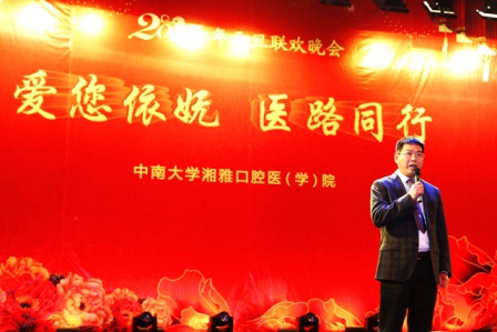 晚会在唐瞻贵院长的新年致辞中拉开了帷幕,唐院长自豪的告诉大家,湘雅口腔医(学)院2014的年初计划已悉数完成,尤其是国家执业医师(口腔类)实践技能考试和考官培训基地;国家住院医师规范化培训基地;大学生校外实践教学基地等三个国家级平台的获得更是让我们备感骄傲与喜悦。新的一年,我们将致力于口腔医学医教协同平台建设和实施人才队伍建设“三个一”工程,每个学科每年有一人在国外知名高校培训学习、有一人在国内知名高校进修学习、有一人在国内巡讲。新的一年,新的希望,让我们携起手来共创口腔医(学)院美好的明天。