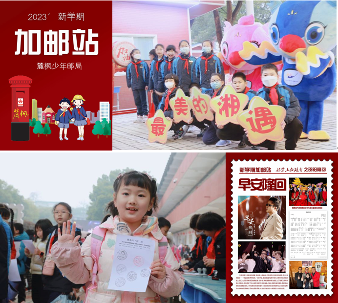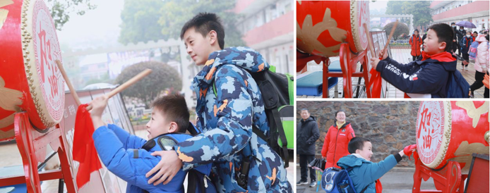鸣鼓迎新春潮涌,千帆竞发争上“邮”!“咚咚咚!”隆重的鼓声从学校里传来。鼓面是一个大大的邮戳图案——撸起袖子的大手,“加油”、“Cheer up”字样赫然在上。红鼓争“邮”,奋勇拼搏!进入校园报到的孩子们依次到红色的开门鼓前,用力敲击出新学期的添“邮”加彩的美好期待。