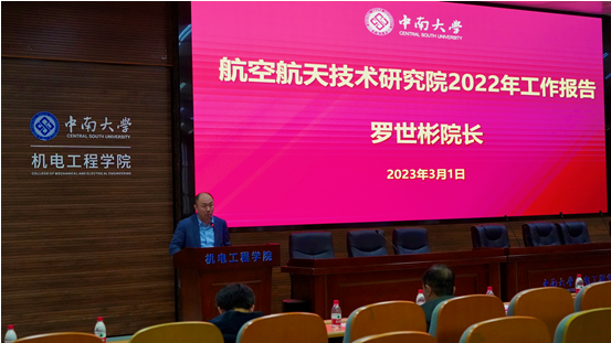 航空航天技术研究院院长罗世彬代表领导班子作《航空航天技术研究院2022年工作报告》。2022年,基于学校学科结构优化调整,航空院从二级学院变为研究院,研究院从稳定师生思想状态、加强制度建设、树立价值导向、树牢底线思维方面着手,实现平稳过渡。他从科学研究、人才培养、平台建设三方面汇报了研究院一年来顺利完成机构转型并取得的一些成绩。