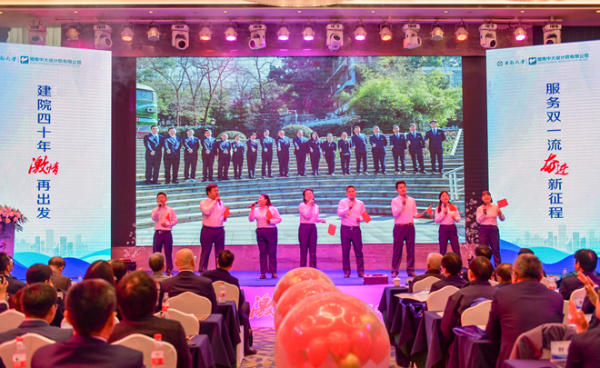 为庆祝建院40周年和加强设计院文化建设,增强品牌影响力,设计院精心创作了院歌《携手并肩向前走》,并在大会上进行首发。当歌声响起在会场上空,寓意深远的歌词、催人奋进的旋律和见证发展的画面让台下的听众们热血沸腾、倍受鼓舞,有些员工豪情满怀,有些员工心情激动,还有很多员工留下了动情的泪水。